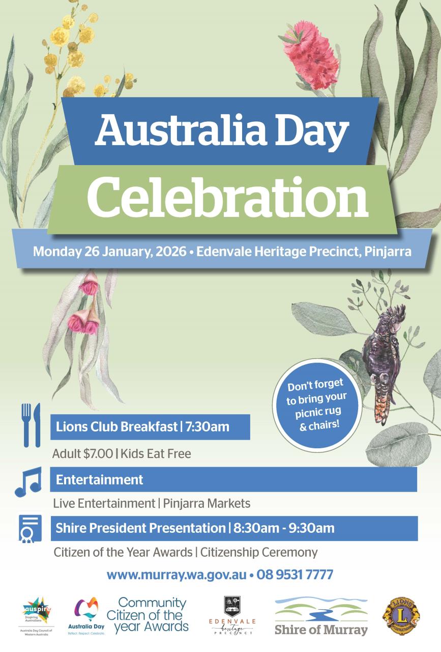 The 2026 Australia Day Celebration hosted by the Shire of Murray at the Edenvale Heritage Precinct is back on January 26, 2026.