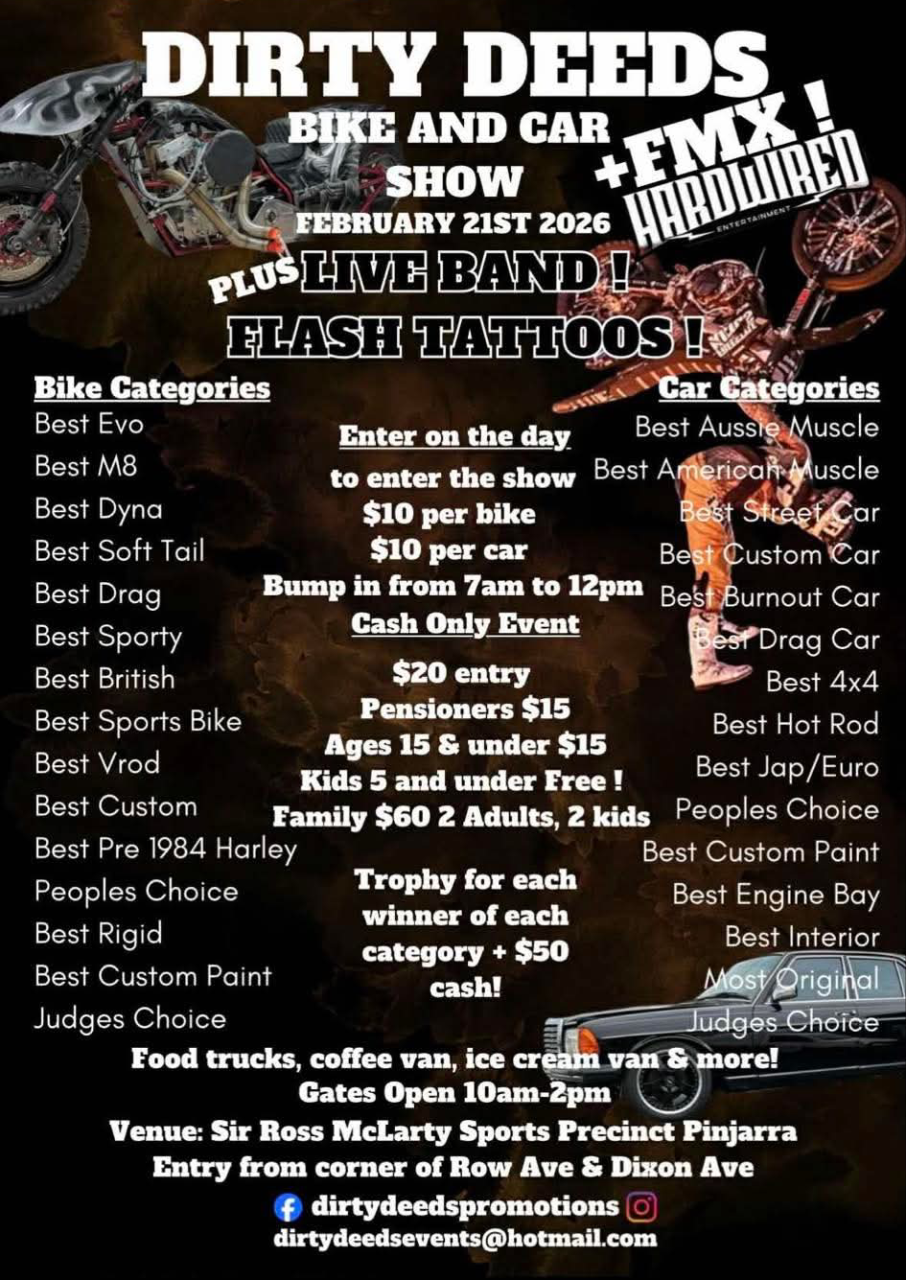 Come down to the Sir Ross McLarty Sports Precinct for the Dirty Deeds Bike & Car Show happening on Saturday 21st February 2026!