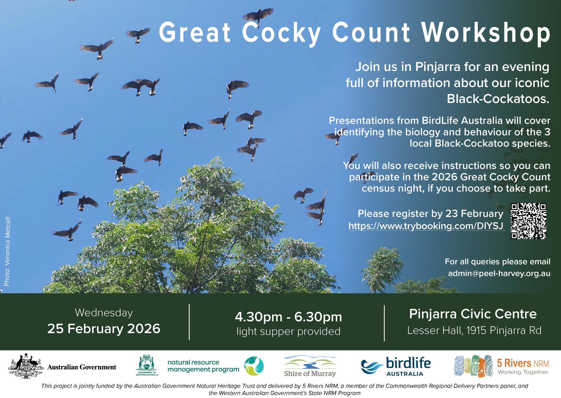 Join us in Pinjarra for an evening full of information about our iconic Black‑Cockatoos. Presentations from BirdLife Australia will cover identifying the biology and behaviour of the 3 local Black‑Cockatoo species. You will also receive instructions so you can participate in the 2026 Great Cocky Count census night, if you choose to take part.