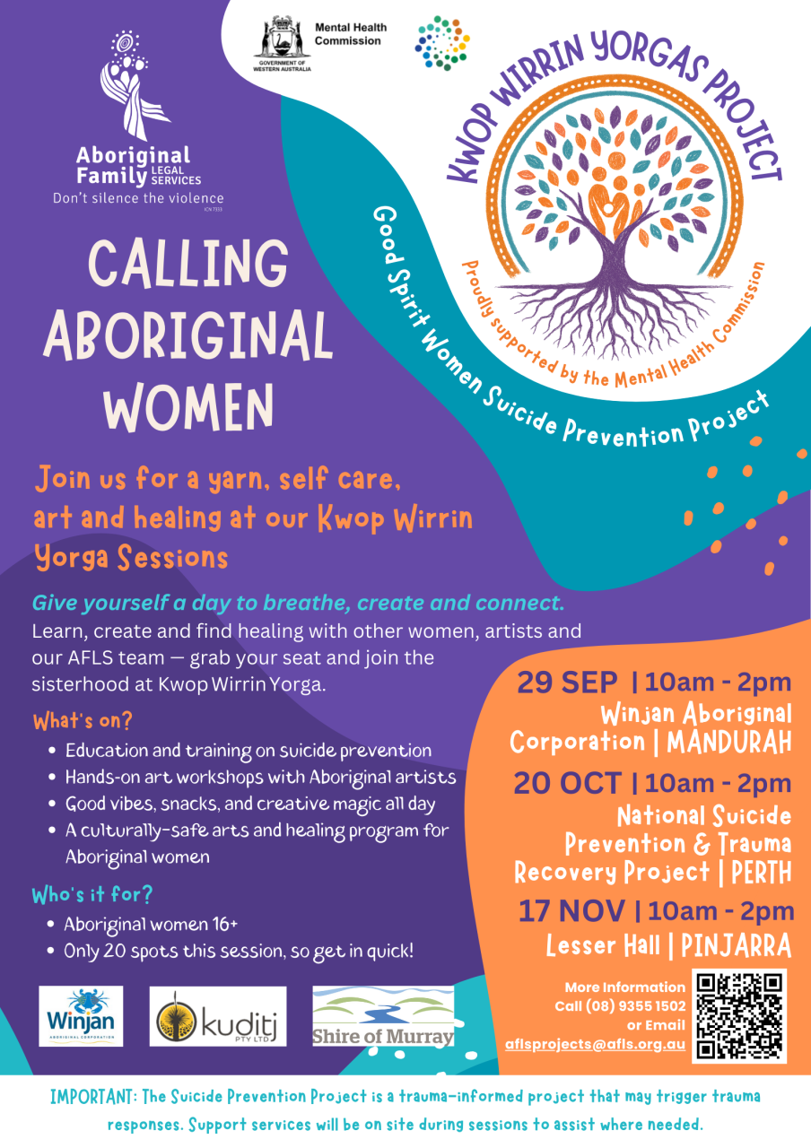 Under the WA Suicide Prevention Grants Program, Aboriginal Family Legal Services (AFLS) is proud to launch Kwop Wirrin Yorga— a powerful initiative rooted in culture, creative expression, and emotional wellbeing.