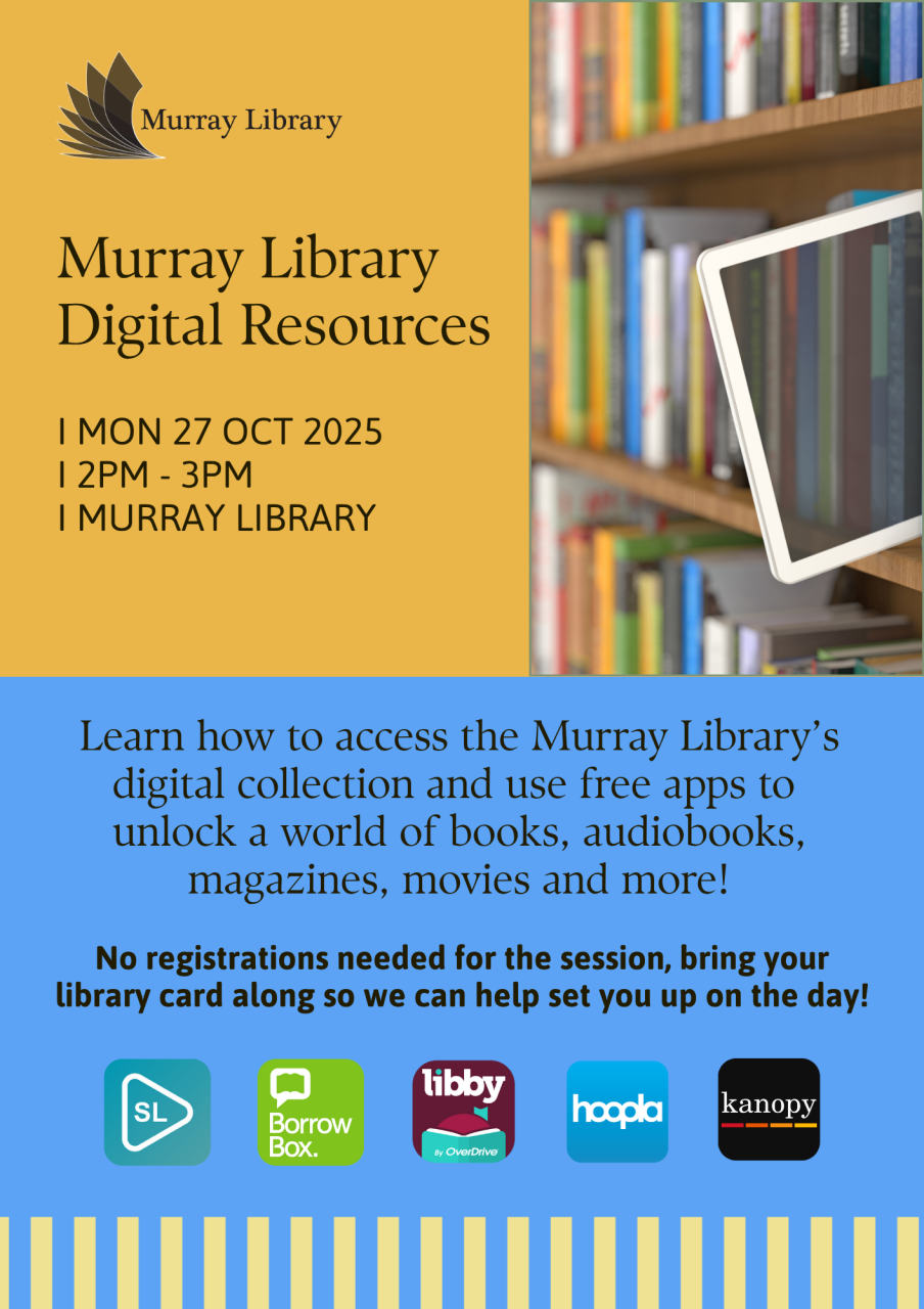 Learn how to access the Murray Library’s digital collection and use free apps to unlock a world of books, audiobooks, magazines, movies and more!