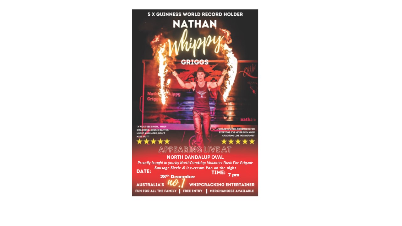 North Dandalup Volunteer Bush Fire Brigade brings Nathan Whippy Griggs to town. Bring a blanket and come down early prior to the show, enjoy a sausage sizzle cooked by the brigade or enjoy a Conesncoffee treat, a state of the art soft serve van ready to serve delicious ice cream and quality coffee.