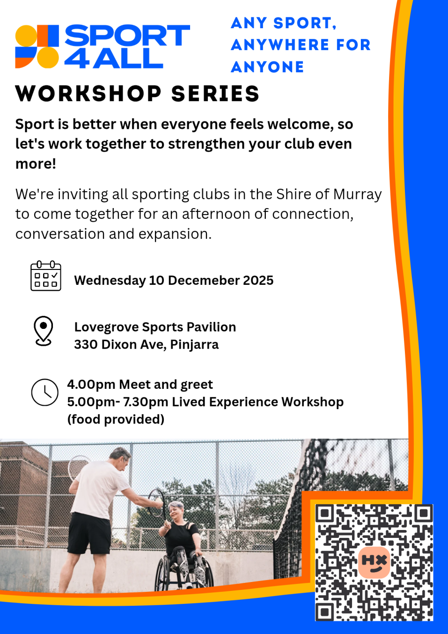 We’re inviting all sporting clubs in the Shire of Murray to come together at the Lovegrove Pavilion for an afternoon of learning, connection and fun.